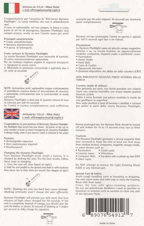 Function: winding for 30 seconds gives up to 5 minutes of light, thanks to the movement of a magnet through a copper spool, which generates an electrical charge successively stored in an accumulator.